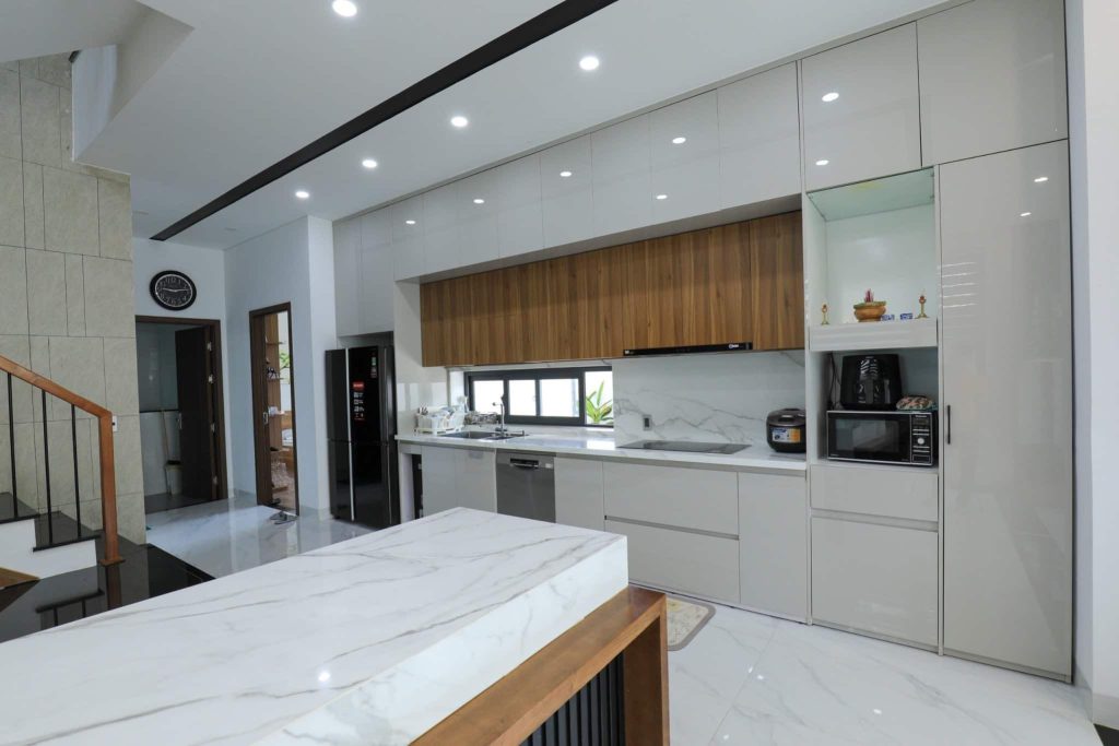 Hình khối kiến trúc hiện đại với những đường nét tối giản, kết hợp vật liệu gần gũi như gỗ, đá và kính, tạo nên diện mạo thanh lịch nhưng vẫn ấm áp, thân thiện. Bên trong, ánh sáng tự nhiên được khai thác triệt để, giúp không gian luôn thoáng sáng, tiết kiệm năng lượng và duy trì bầu không khí trong lành. Khu sinh hoạt chung được bố trí mở, kết nối liền mạch giữa phòng khách – bếp – sân vườn, tạo nên sự gắn kết và tương tác tự nhiên giữa các thành viên gia đình.