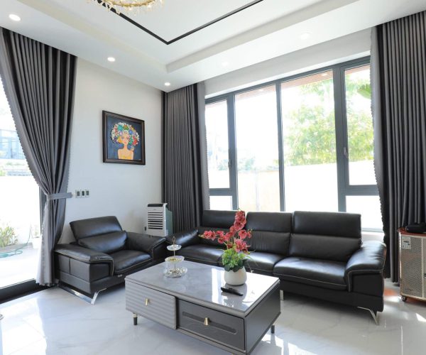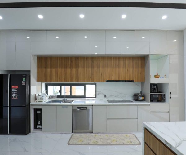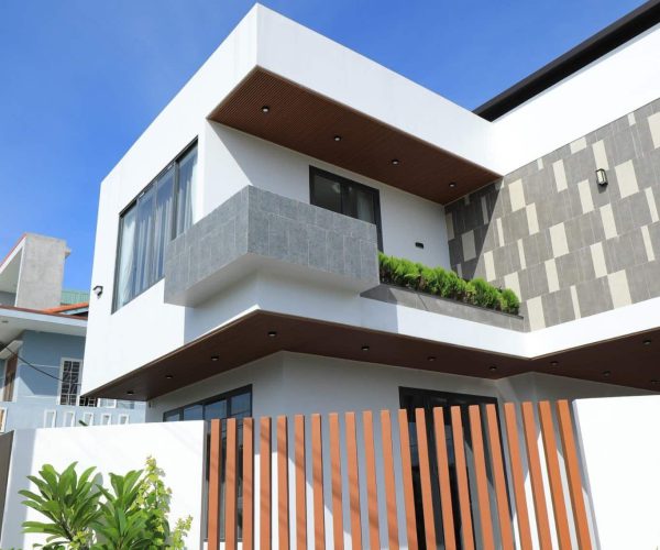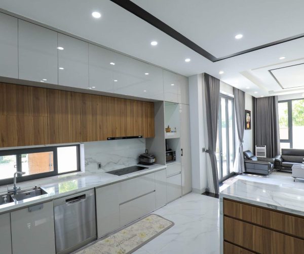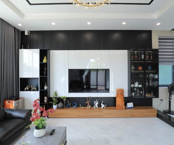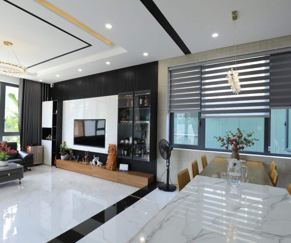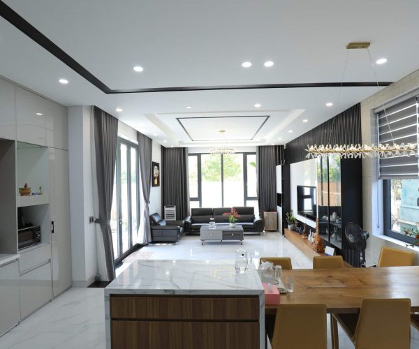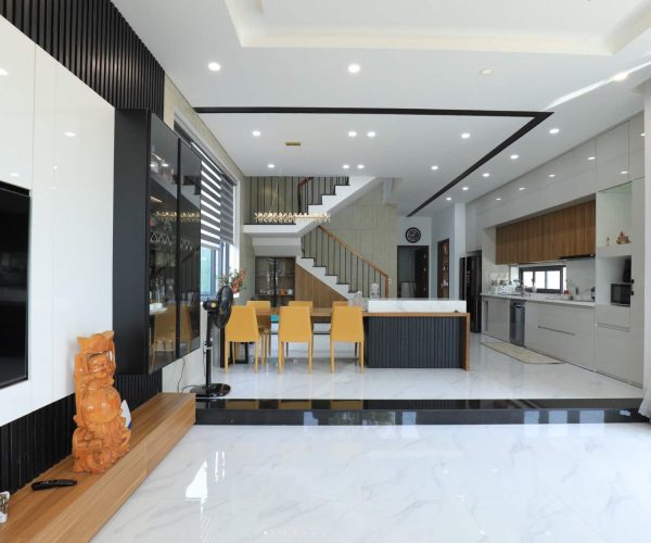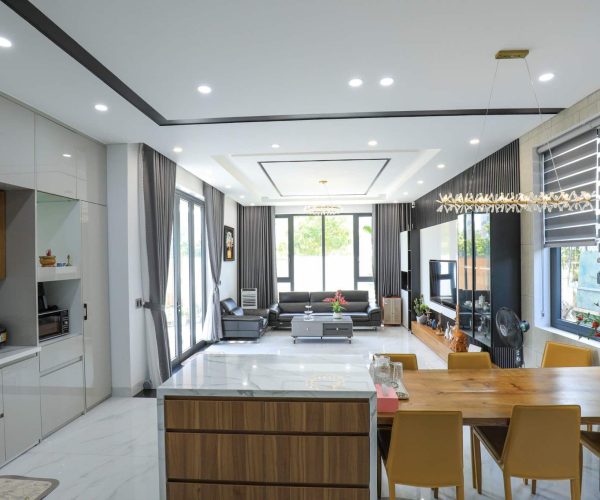 Hình khối kiến trúc hiện đại với những đường nét tối giản, kết hợp vật liệu gần gũi như gỗ, đá và kính, tạo nên diện mạo thanh lịch nhưng vẫn ấm áp, thân thiện. Bên trong, ánh sáng tự nhiên được khai thác triệt để, giúp không gian luôn thoáng sáng, tiết kiệm năng lượng và duy trì bầu không khí trong lành. Khu sinh hoạt chung được bố trí mở, kết nối liền mạch giữa phòng khách – bếp – sân vườn, tạo nên sự gắn kết và tương tác tự nhiên giữa các thành viên gia đình.