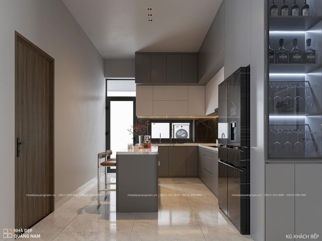 Bước vào bên trong là không gian mở thoáng đãng, kết nối liền mạch giữa phòng khách và bếp. Sự bố trí khoa học giúp ngôi nhà vừa rộng rãi, vừa tiện nghi, là nơi các thành viên có thể quây quần, chia sẻ những khoảnh khắc ấm áp. Nội thất sử dụng tông xám – trắng chủ đạo, điểm xuyết sắc nâu ấm, mang lại cảm giác sang trọng nhưng vẫn gần gũi và dễ chịu.