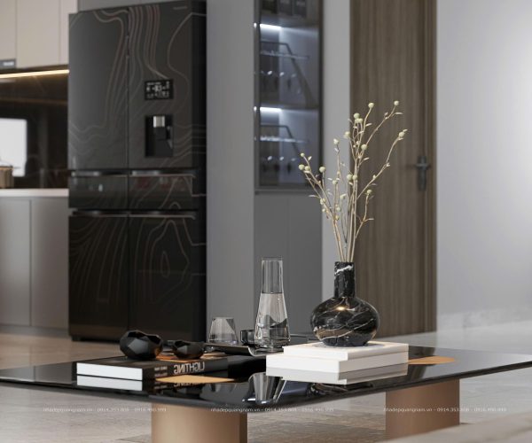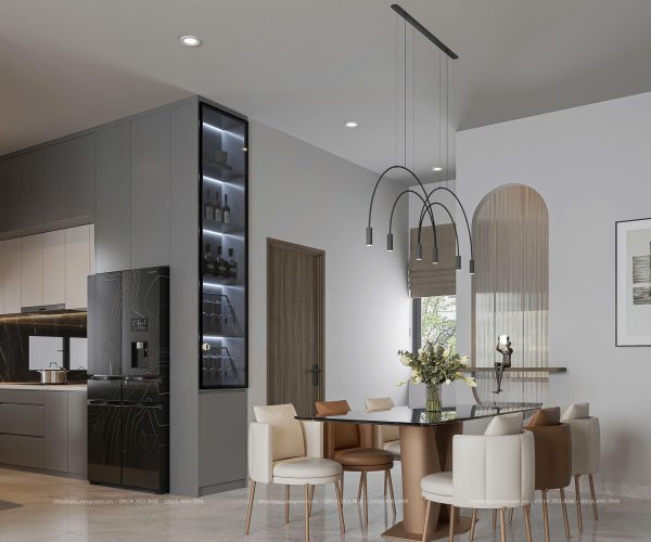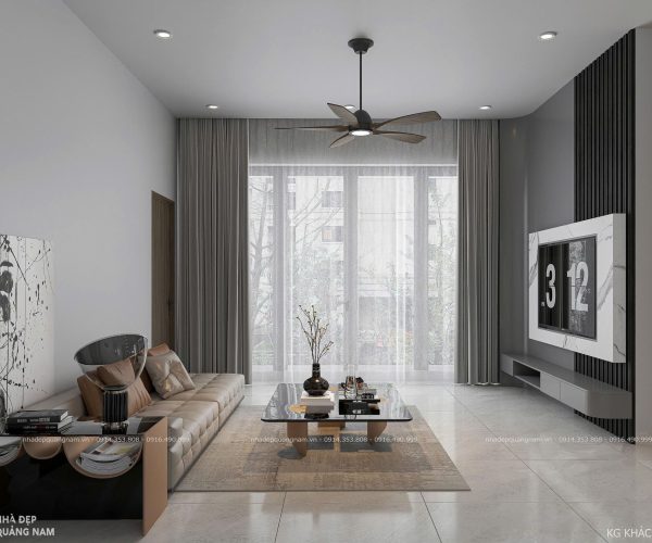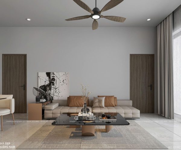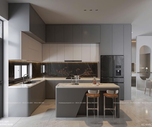 Bước vào bên trong là không gian mở thoáng đãng, kết nối liền mạch giữa phòng khách và bếp. Sự bố trí khoa học giúp ngôi nhà vừa rộng rãi, vừa tiện nghi, là nơi các thành viên có thể quây quần, chia sẻ những khoảnh khắc ấm áp. Nội thất sử dụng tông xám – trắng chủ đạo, điểm xuyết sắc nâu ấm, mang lại cảm giác sang trọng nhưng vẫn gần gũi và dễ chịu.