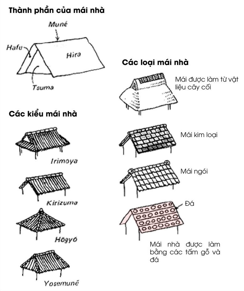 Hình vẽ mô tả các kiểu mái Nhật, trong đó có Hogyo không được nhắc đến trong bài vì đây là kiểu mái chỉ dành cho các công trình Phật giáo. Ảnh: Tư liệu