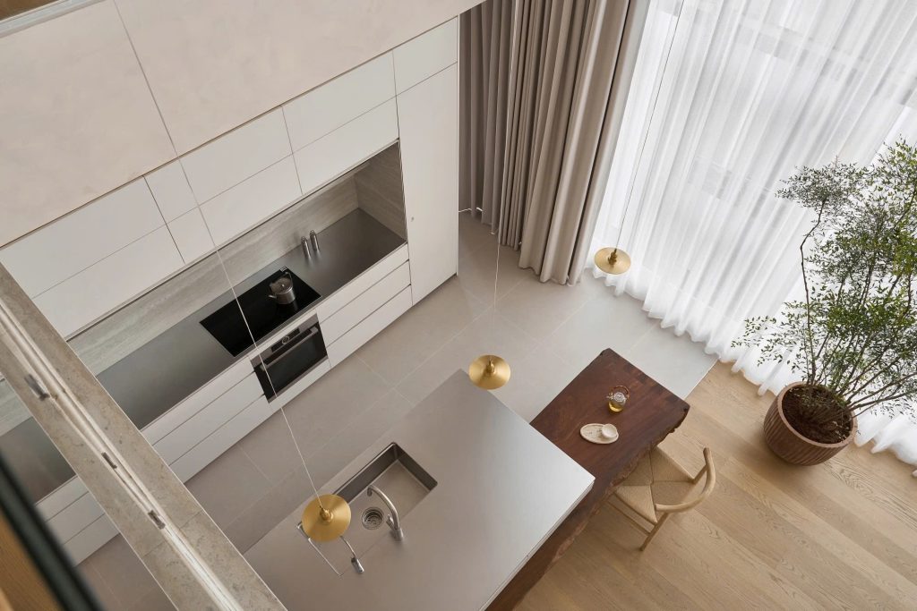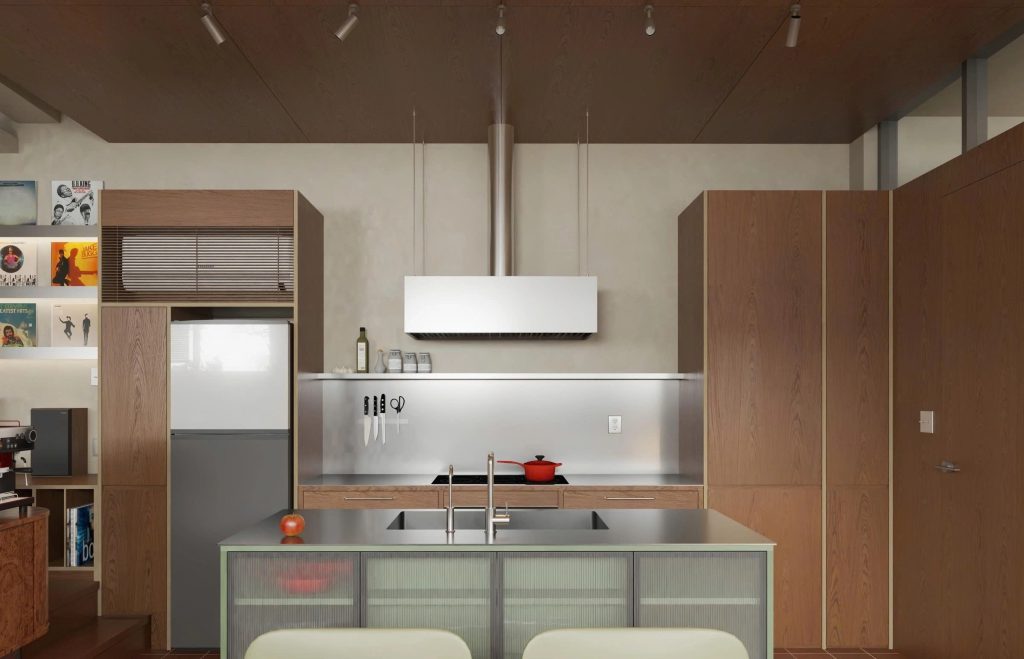 Ở Việt Nam, phong cách thiết kế có sử dụng nội thất inox cũng đã xuất hiện ở nhiều căn hộ. Tại khu vực bếp của một căn penthouse ở Hải Phòng, KTS đã lựa mặt inox dày 6 mm, được hàn liền chậu, tạo nên một mặt bếp liền mạch. Thiết kế này đặt sự tối giản, vệ sinh và khả năng khử khuẩn làm trung tâm trong căn bếp.